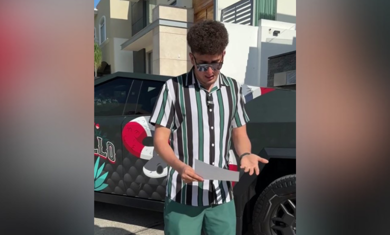 “Tesla me está demandando por hacer esto, pero esta camioneta no se va”, sentenció el influencer mientras destrozaba el comunicado de la compañía de vehículos.