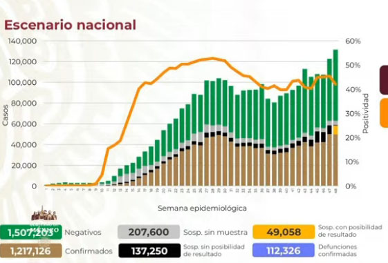 Respecto al porcentaje de positividad dijo que es de 42% para la semana 48. Ocupación hospitalaria La ocupación hospitalaria es de 15 mil 475. Es decir, una ocupación total del 39%. Respecto a las camas generales, se registró una ocupación del 41%. Un 34% de ocupación en camas con ventilador, que son utilizadas por los pacientes que se encuentran con un diagnóstico crítico
